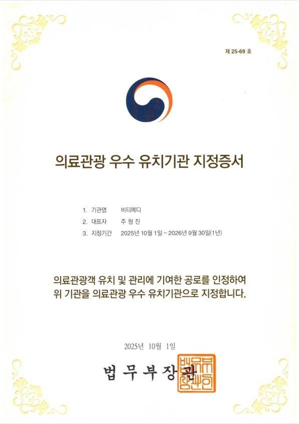 비티메디가 대한민국 법무부로부터 2025년 의료관광 우수 유치기관으로 공식 선정되었습니다.
